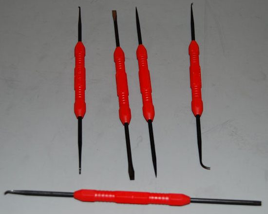 You’ll also need a few hand tools that will help greatly when soldering.  The first is a fiberglass pen (see image to right), which is the best method of mechanically removing oxidation.  You will also need some side-cutters that are made specifically for board work (one side is flat for clipping leads).