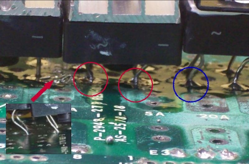 A photo from one of my favorite forum posts is shown in Image 5.  The unnamed individual posted before and after pictures and was actually bragging about his solder job.  Notice the two rectifier leads circled in red (the rectifier he replaced) and compare them to the blue circled lead.  On both of the blue circled leads you can see where the solder did not adhere properly to the component leads.