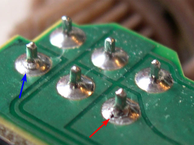 Another curiosity arises if you look at the small before photo and compare it to the area the red arrow is pointing at.  I don’t know if that’s due to excessive solder (like way excessive) or if he overheated the board and bubbled the green solder mask.  Either way, nothing to brag about.
