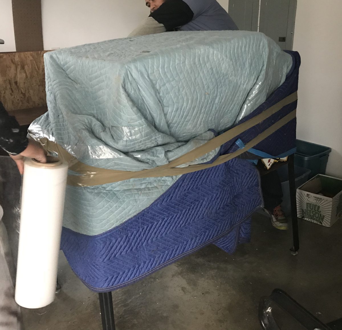 We then stretch wrap everything. And then wrap a moving quilt and secure it in place.
