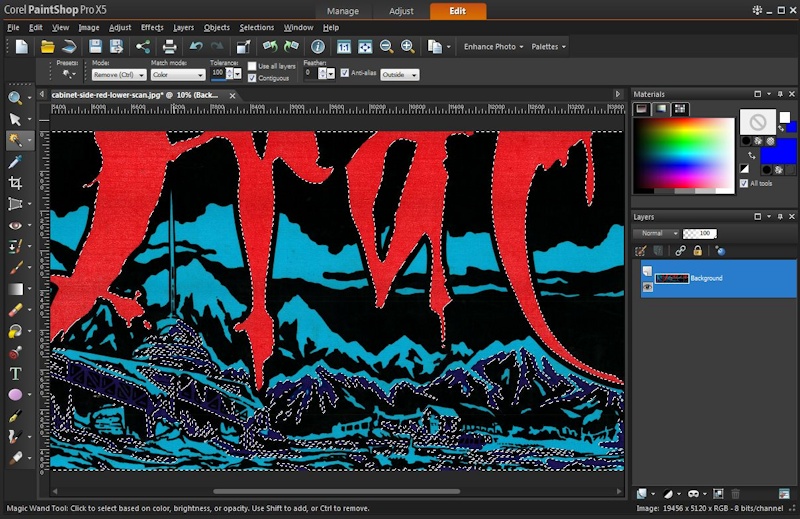 In my example (Bram Stoker’s Dracula) I’m creating a stencil to repaint only the faded red area. So next I used the eraser to remove all of the other areas and then selected the background white color with the “Magic Wand” (more on this later). I then chose Selections -> Invert to make what will become my red areas active (the reason for this two-step approach is to include the 1 pixel gray border in the area I’m painting red).