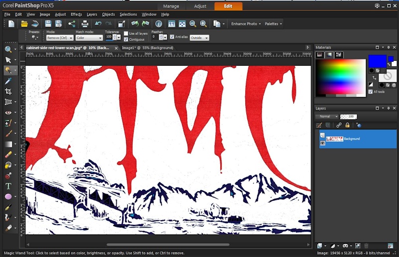 One of the inherent issues with a camera or scanner image is that it will be anti-aliased. This is the blurring of the transition where two colors come together (see Image 5, where the red area meets the black area). Pinball graphics are typically made with a stencil or silkscreen, which provides a well defined border between colors. So while editing the image we need to remove the anti-aliasing to create a more original look.
