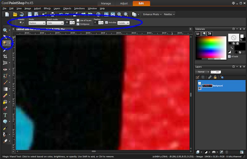In Image 5 you can see the “Magic Wand” tool circled on the left and the tool parameters circled on the top. While other products may have different settings, all will have a tolerance setting which you will be your most important adjustment.