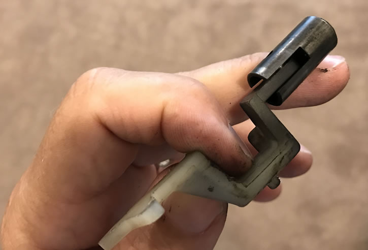 20) Using the two screws, install the top plastic holder and wire tab. This plastic holder keeps the plunger in place as well as the lock wire. Note that the lock wire fits under the plastic holder in the slot provided in the back of the tab. It will be obvious when this is assembled properly and it will not fit well if it is not.