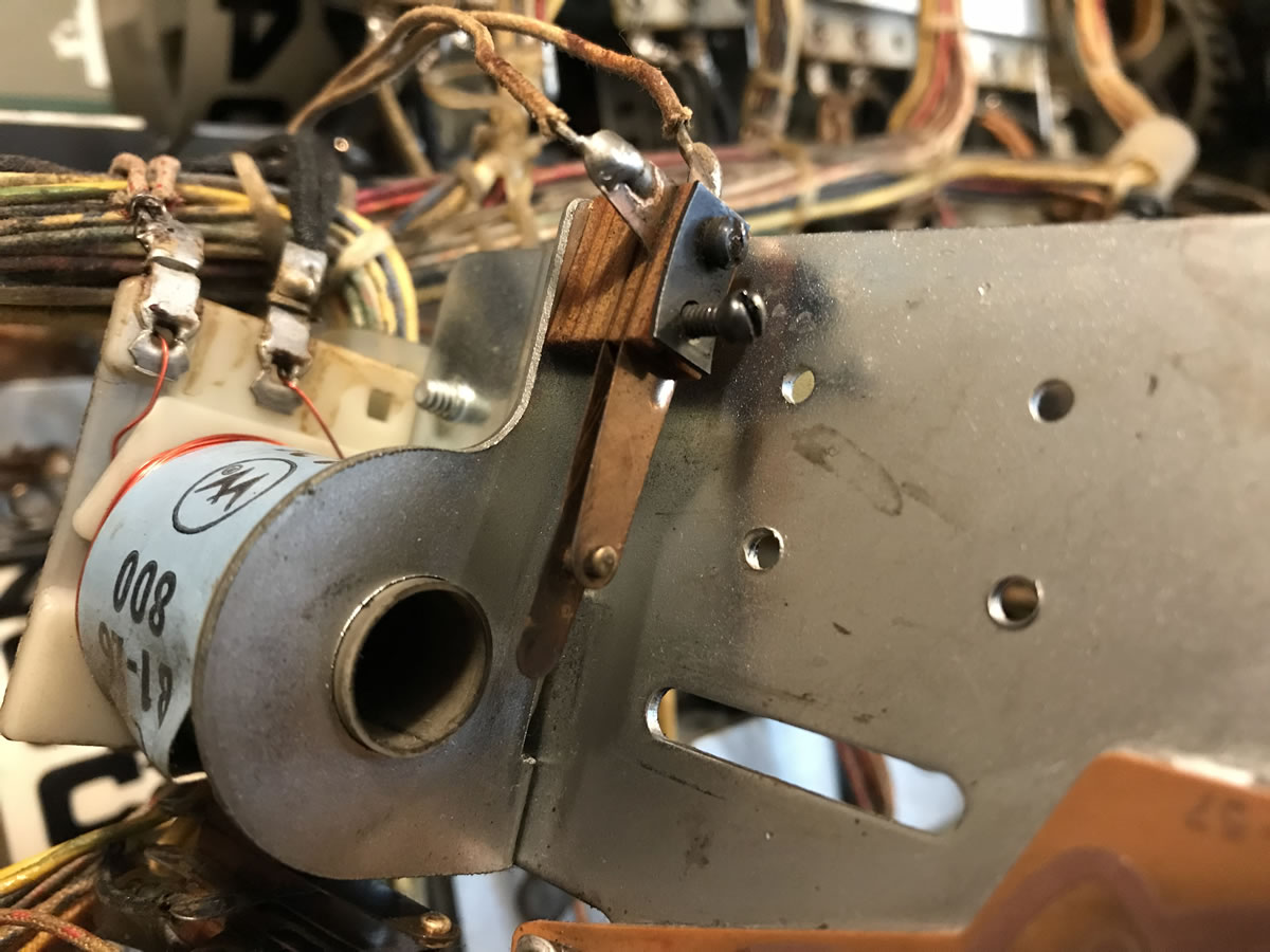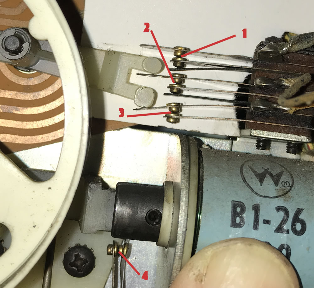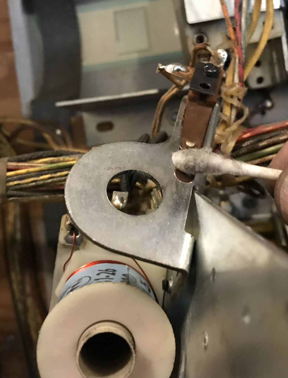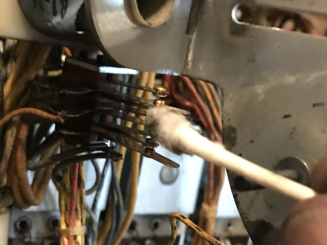 16) Clean the leaf switch contacts. Generally, all that is needed is a Q-tip and isopropyl alcohol. If there is arching damage on the contacts, clean with the Dremel and the carbon steel brush, or Dremel sanding flap wheel. This can remove the damaged area of the contacts. Another technique is to put a fine metal file between the two contacts, pinch them together and drag the file back and forth. Each technique has its advantages and detractors.