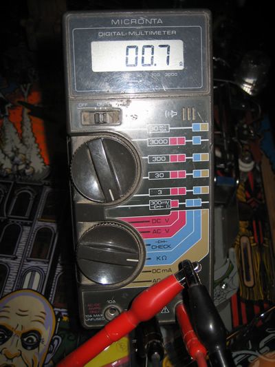 This setup is testing the fuse for resistance. A good fuse will test almost zero resistance (to the limit of the voltmeter). For illustration, this shows testing with the fuse removed from the game. The easiest way to test is to just remove one end of the fuse from the clip fuse holder on the circuit board. Leave the other end in place, holding the fuse. Then check the resistance.