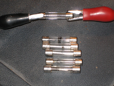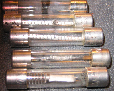 In the photo to the right, all the fuses are blown. The top one is what most people expect to see. The center one is fairly subtle. Follow the wire that is twisted around the white material and in the center, it is broken (click on the photo for a larger image). If that fuse is in its holder and that part of the wire is hidden, you will never see it!