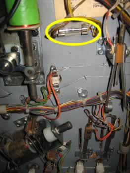 The location of fuses in a Bally pinball machine from the late 70’s to the mid- 80’s. These fuses are located on a board below the playfield. The main fuse is on the lower left.