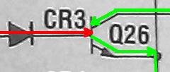 Also, check both sides of CR3 (A & B on the photo). We want to be certain that 28 VDC is not present. If there is voltage there, then Q26 is blown (shorted) and must be replaced.