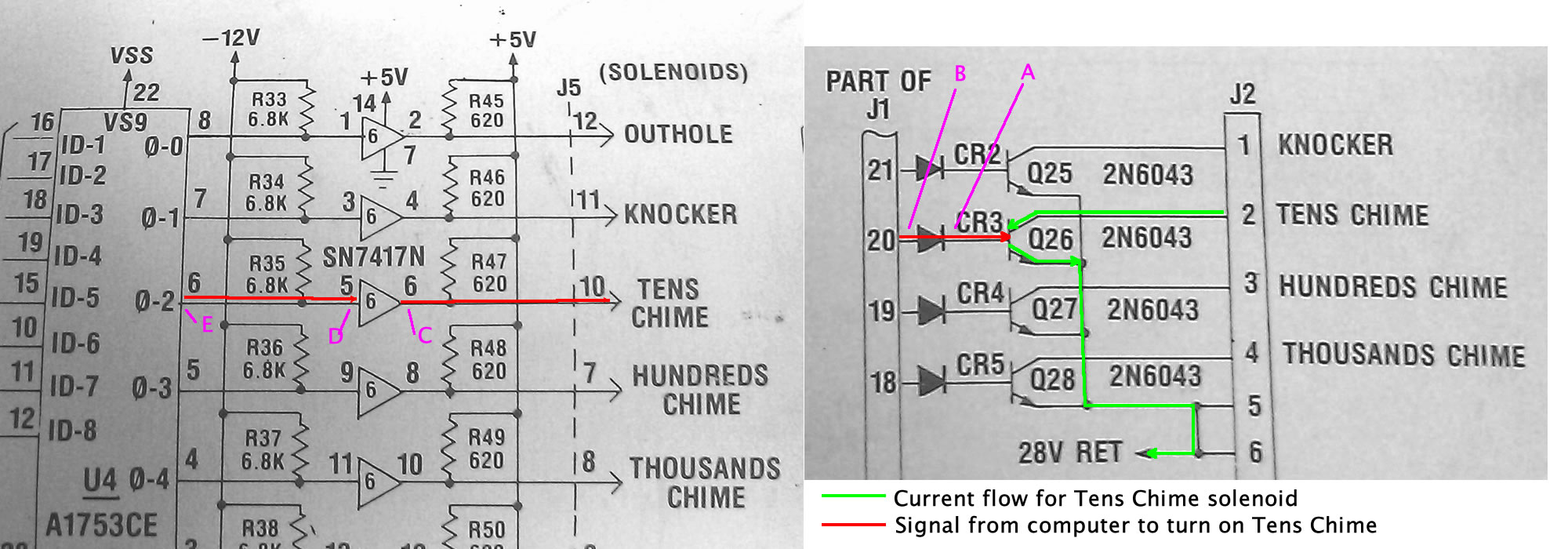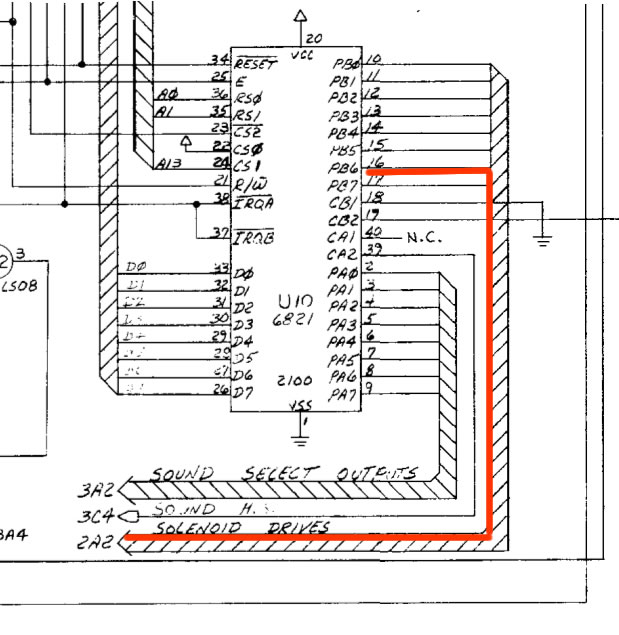 7) If there is not a pulse to the input of U17, then we need to trace to the next chip. Reading this circuit diagram gets more complicated. This signal is coming in the “Solenoid Drives” signal. Note that the input to pin 9 is labeled as PB6.