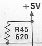 The right picture is +5 VDC. Resistors are always a symbol of those zigzag lines and the letter “R”. The value for R33 is 6.8k ohms (6,800 ohms). R45 is 620 ohms.