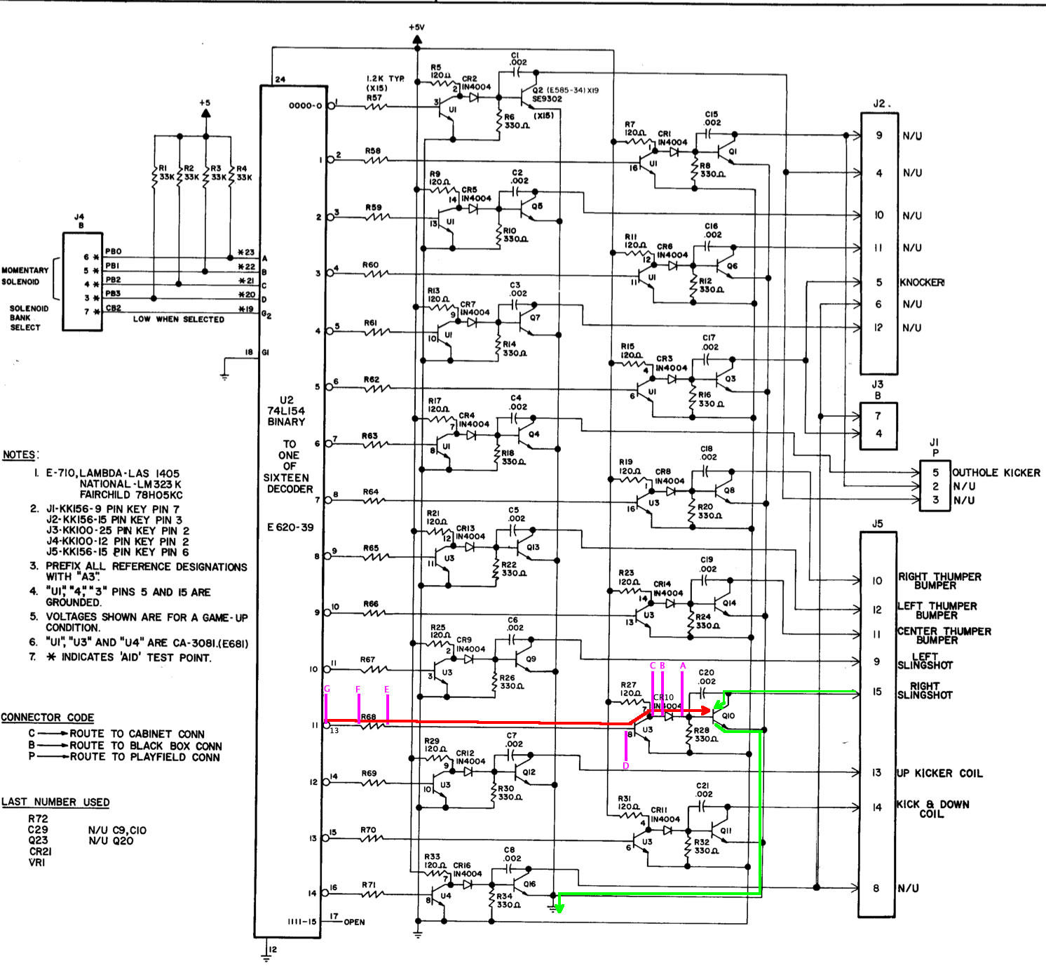 Signal at “G”? Then a broken trace between U2 and R68. If no signal at “G”, U2 pin 13, then U2 is likely defective. U2 is a decoder chip – see the Decoder Chip section. If one of the connections to it (pins 12, 18 – 24) were bad, many of your solenoids would not work properly.
