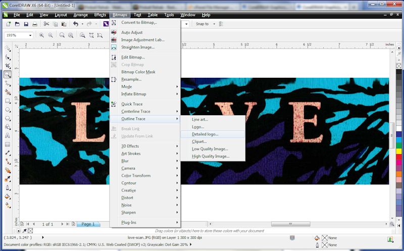 The first step is to create a new image in CorelDRAW that is the same size as the image you will be importing.  Then go to File -> Import and select the scan or photo image you’ll be working with.  Once you’ve done that go to Bitmap -> Outline Trace -> Detailed Logo or High Quality Image (see Image 1).