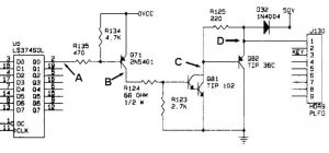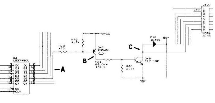 If the LS374 tests good, go on to test point B.  If test point B is high then the 2N5401 is bad.  If it reads good then check test point C and if it is low then the TIP102 is bad..  In either case it’s a good idea to replace all three transistors when one goes bad.