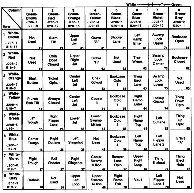 Note: Switch columns and rows are not wired in the same order as they are shown on the switch matrix. For example in column 6 the physical wire might go from “Left Ramp Enter” to “Thing Eject Lane” to “Train Wreck.”