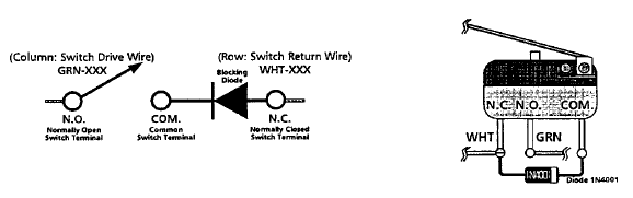 By cycling through each column sequentially, the system can differentiate between the switches in each column while the rows are separated by the blocking diodes. If a diode is shorted, or has been installed incorrectly, the system will get confused since the isolation between switches no longer exists.
