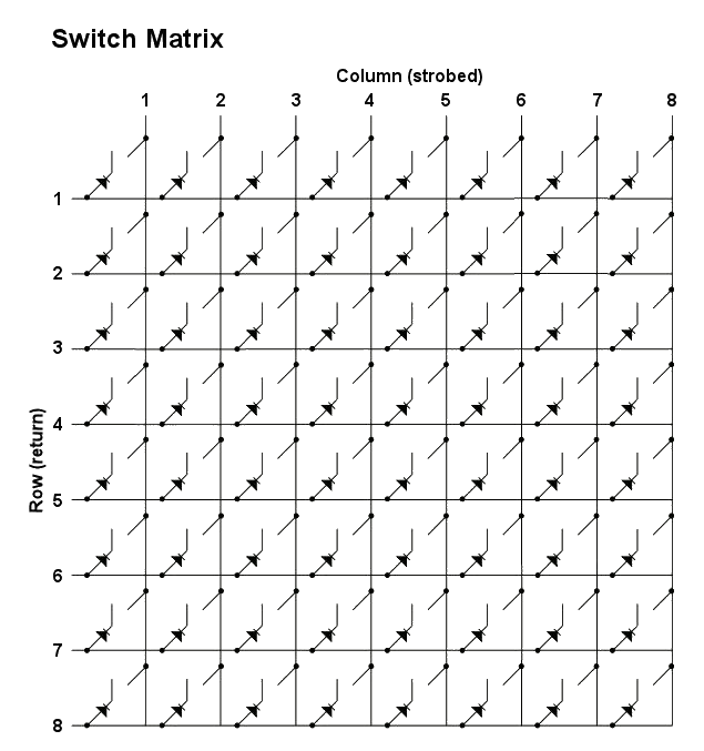 The purpose of the switch matrix is to reduce the number of driver circuits from 64 to 16 and minimize playfield wiring. This is achieved by pulsing each column sequentially while monitoring all of the rows. This is why the column is called the strobe, or send side, and the row is called the return side.