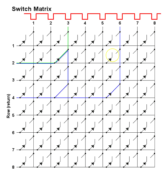 In Image 8, the switch at column 3 row 2 is closed in addition to the previous switches. Now bad things start to happen. The shorted diode and the closed switch allow row 2 to be taken low when column 6 is pulsed low. So the system falsely thinks the switch at column 6 row 2 is closed (see yellow circle).