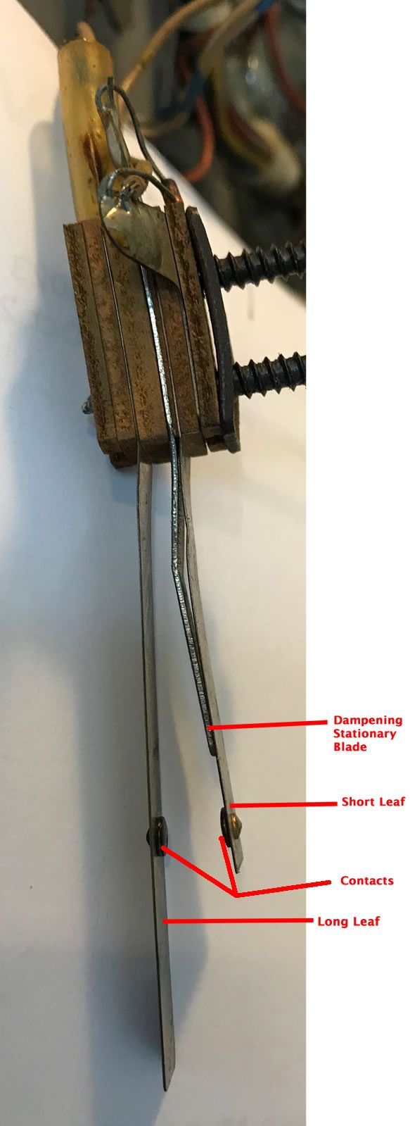 And these contact point / tabs at the end of the leaf switches sometimes fall out. Or get loose. If they get loose, we have had luck with soldering the backside of the switch and contact point together. And with some switches, the tab where the wire solders to the switch is a separate piece from the leaf. We have thought that it is possible that some oxidation (tarnish) might occur between the two.