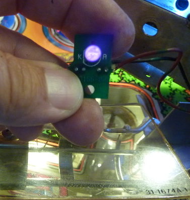 Option #1 is the least expensive. Raw optos, which are LEDs, are cheap. There are only two leads that must be unsoldered to remove it. The only trick is that they must be oriented in the proper direction (see photos below). For example, the Williams 6 or 7 ball trough opto boards are roughly $100.00. But the individual components (QED123 for the transmitter, and QSD124 for the receiver on most WPC pins) are only $0.65 – $1.00 or so each. So the transmitters and receivers can all be replaced for less than $12.00. And, if you are really feeling lucky, try replacing just the transmitters for $6.00 or less.