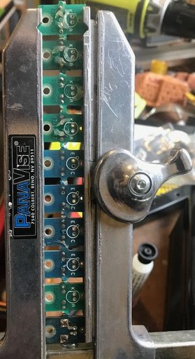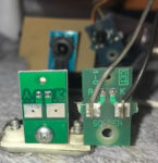It is crucial to insure that the same wire is connected to the same position (see ‘Positioning to Move Wires’, above). We remove the old board, install the new one, then solder the wires one at a time to check that they are soldered to the right place. The transmitter have pads clearly marked ‘K’ and ‘A’, while the receiver has pads marked ‘E’ and ‘C’.