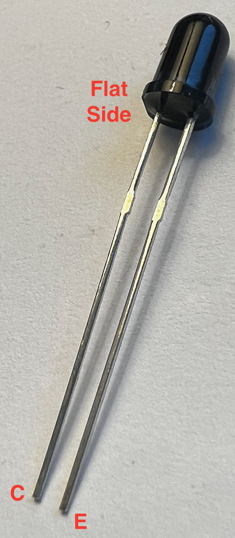 Note that the darker opto is the photo transistor – the receiver. This is the Williams WPC opto receiver board and a replacement is QSD124, a NPN Infrared Phototransistor. In the original board, there is a drawing of a ‘tab’. The raw transistor we received do not have a tab. Instead, it has a flat side. The flat side is the shorter ‘E’ lead which should be positioned towards the ‘tab’ on the board. As far as we can tell, all QSD124 photo transistors have the same lead orientation.