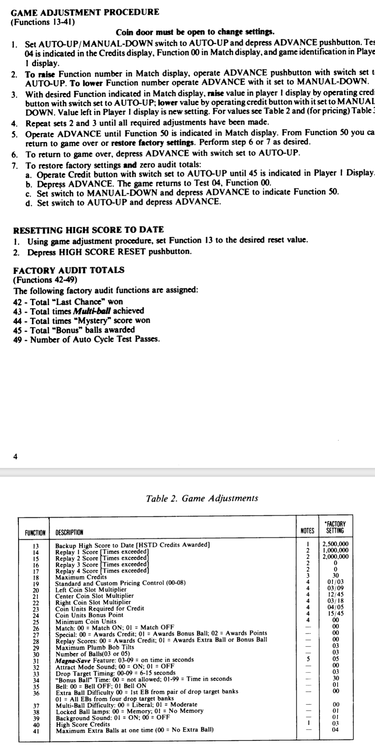 11) Use your manual so that just one game is added when hitting the start button. This process varies from game to game, but usually involves changing the small switches on the MPU board.  This is under the ‘Game Pricing’ section.  It will still work if more than one game is added, but one game added per one game started is a more elegant solution.
