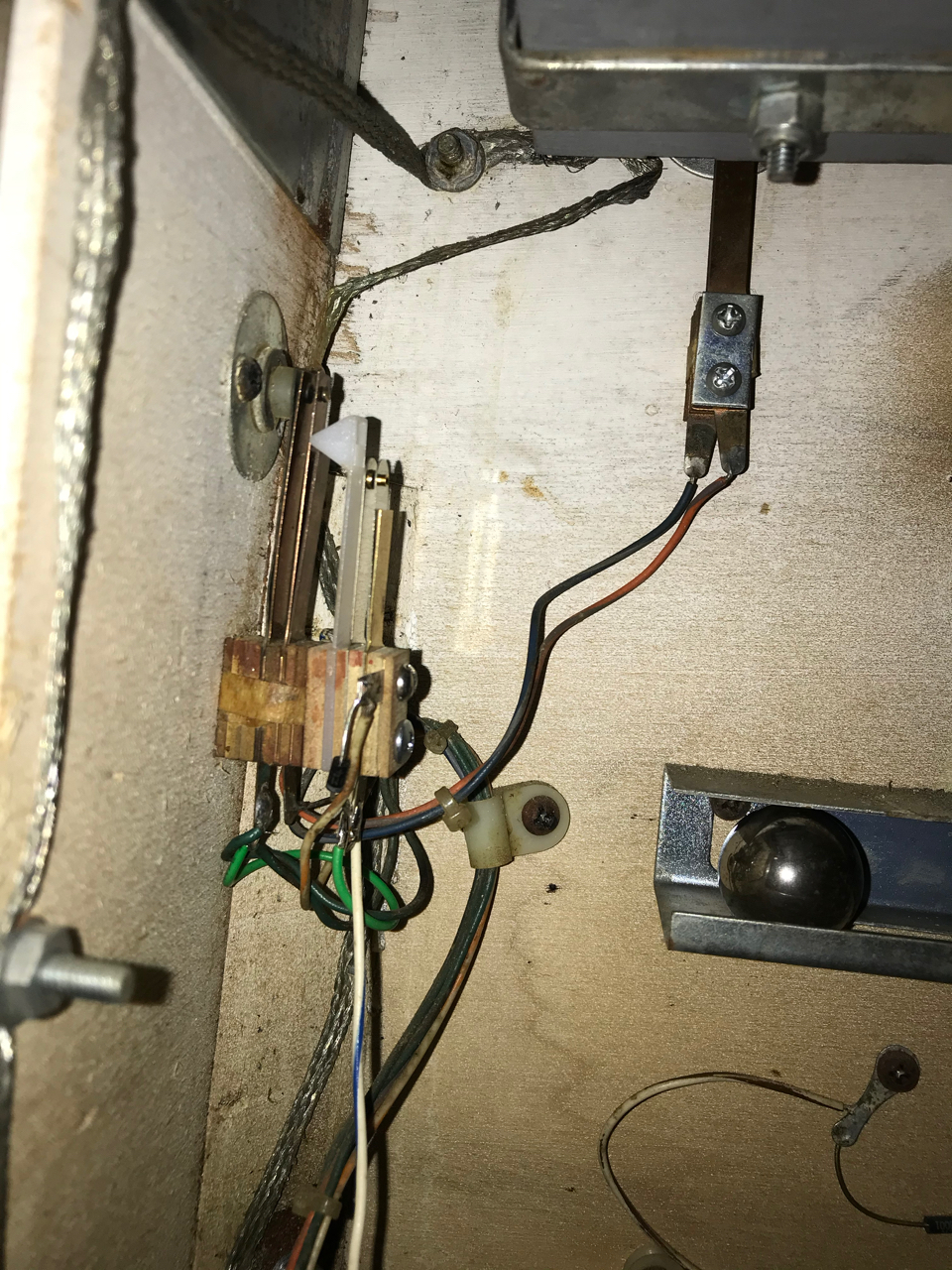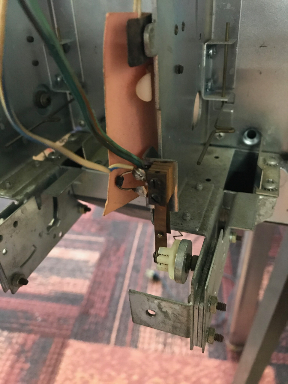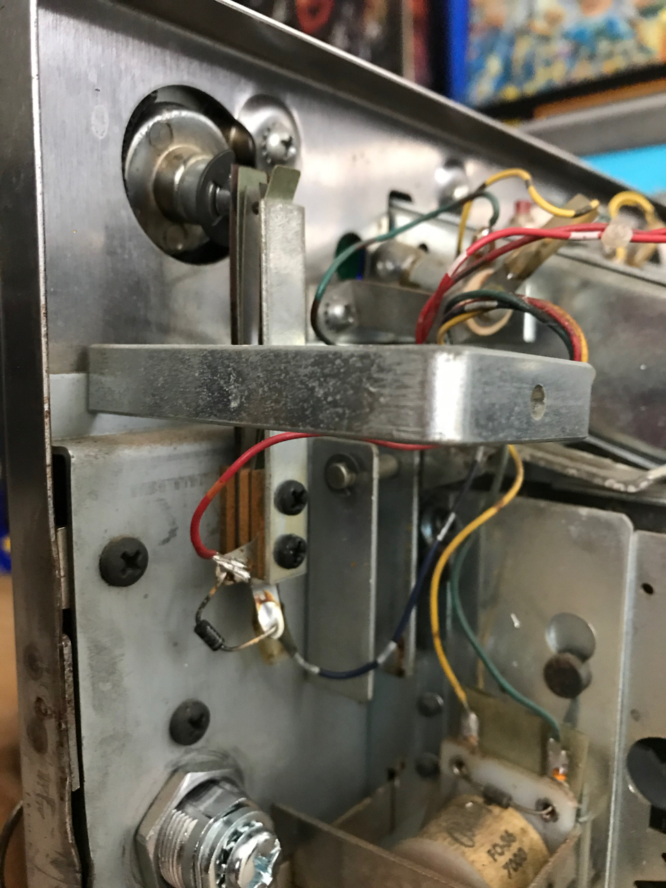 In the third picture, there are zero games on the free play wheel on a Williams Grand Prix. The arm pushes down and the switch should open.  But the top contact has been bent down so that the switch makes contact.  This allows free play when there are zero games present.