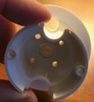 If everything is aligned properly, the metal pop bumper ring will be able to slide over this assembly with the two rods going through the holes (see ‘notch’ photo above) and into the playfield below. Install the pop bumper cap to keep the metal ring from falling back out.