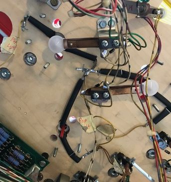 Once the upper body is installed, the wires for the pop bumper lamps must be routed, stapled and soldered into place. This is easier to do now than when the pop bumper solenoids / coils have been reinstalled. We install shrink tubing over the bare wires to prevent shorts.