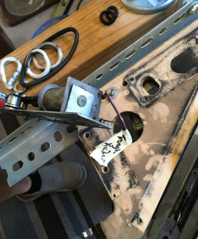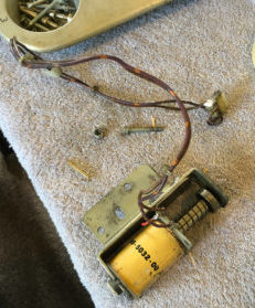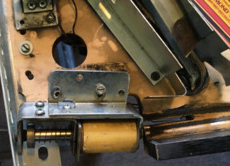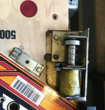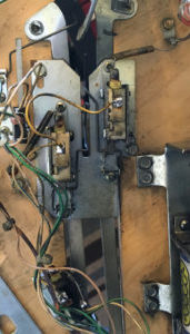 Pick your next section. At some point, this will be the ball trough down at the bottom of the machine. That includes pieces that are above the playfield, but attached from below. There are also coils and mechanisms involved. You could leave those in place, but since we will be rebuilding them, we find it easier to remove them. They can be left hanging by the wires, but it is safer to unsolder them – mark and photograph where the wires go. We also label the wires. Note that if the coil has a diode, it is crucial to know which wire goes on which tab.