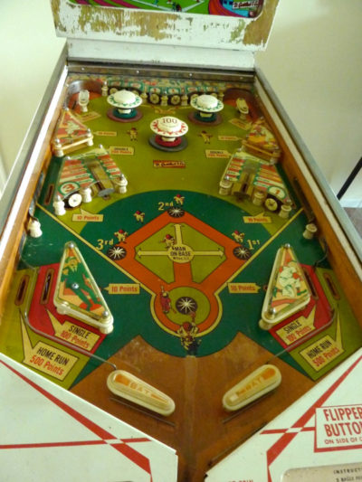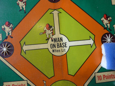 In photos 11 – 13, we have an Gottlieb Play Ball. This had a layer of filth on it along with yellowed lacquer. Removing that not only removed most of the damage, but it also brightened the colors. There were a couple of spots that required small decals.
