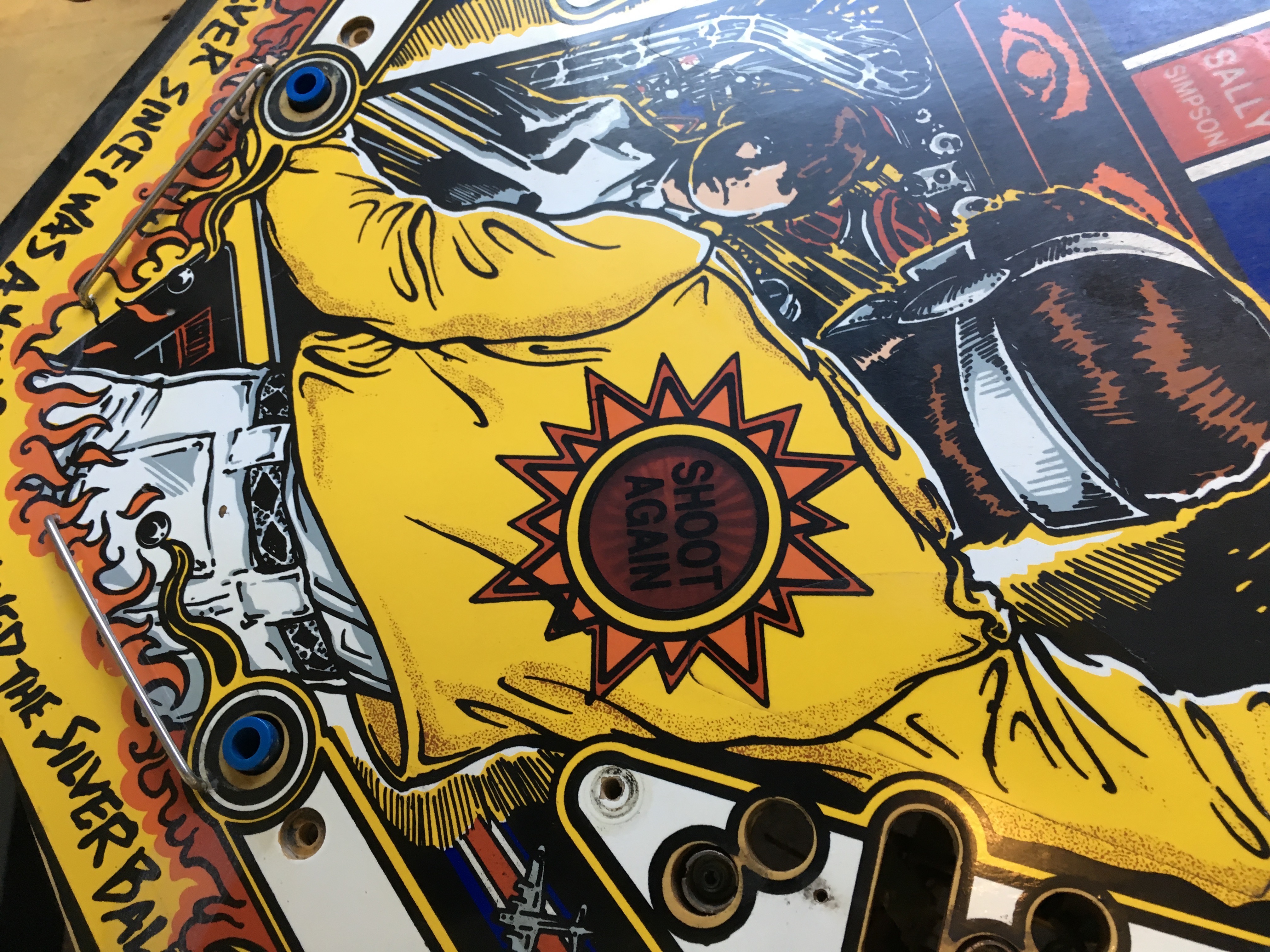 Earlier pinball machines had lacquer finishes.  These do not protect as well.  They also tend to ‘melt’ into the paint surface.  Plus they yellow with time.