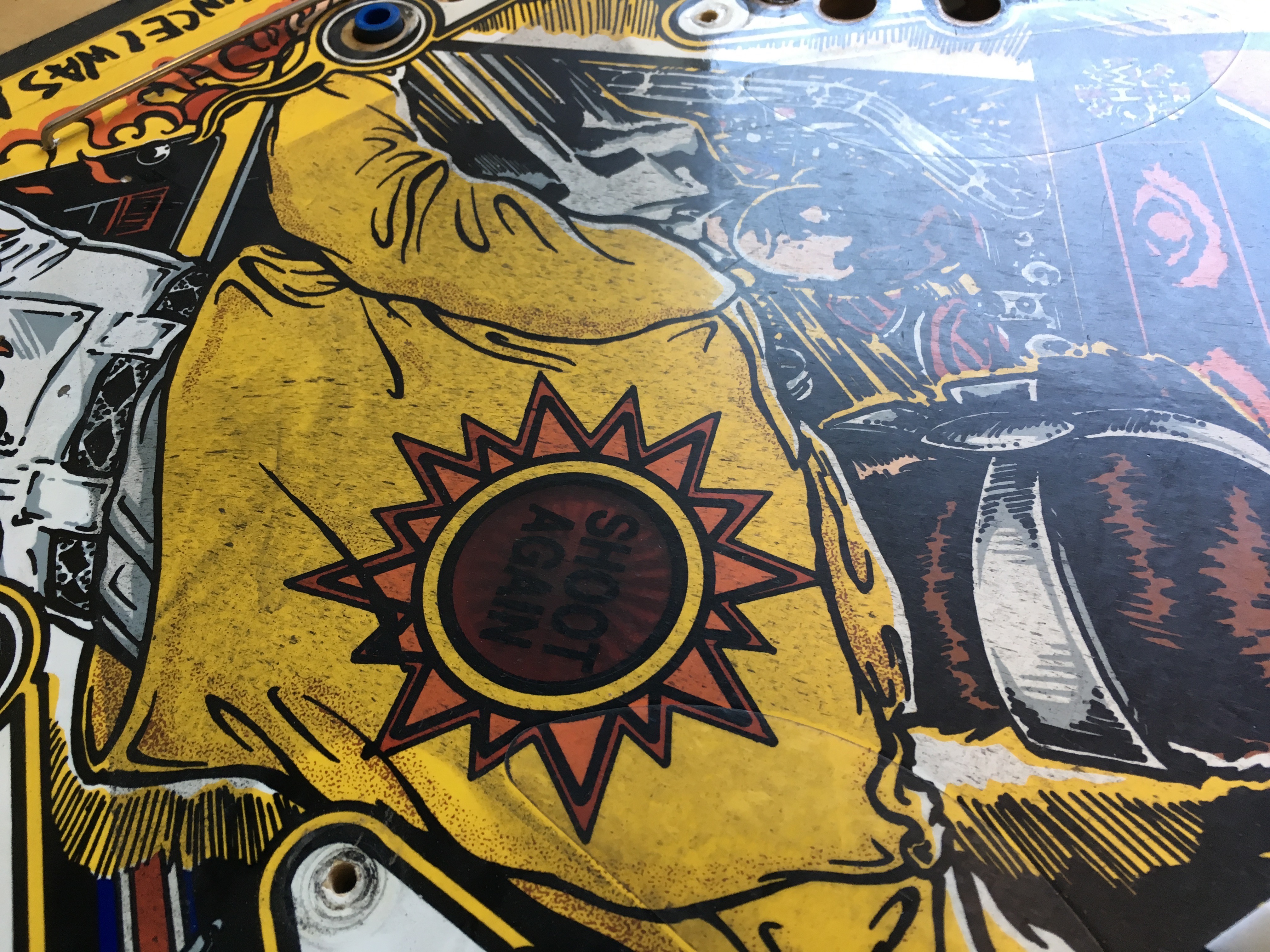The curse of games too old to have a hard finish are ball swirls.  These are curly lines that appear over the playfield and are caused by a combination of old, chipped pinballs and dirt.  Curing this is tricky.  If the swirls are not too deep, it maybe possible to remove a layer of paint and get it looking much better.  But removing that layer of paint also removes the outer protective layer – or what is left of it.  For older games, that layer is usually lacquer.  Once you cut through the protective layer, you will have to re-apply clear.