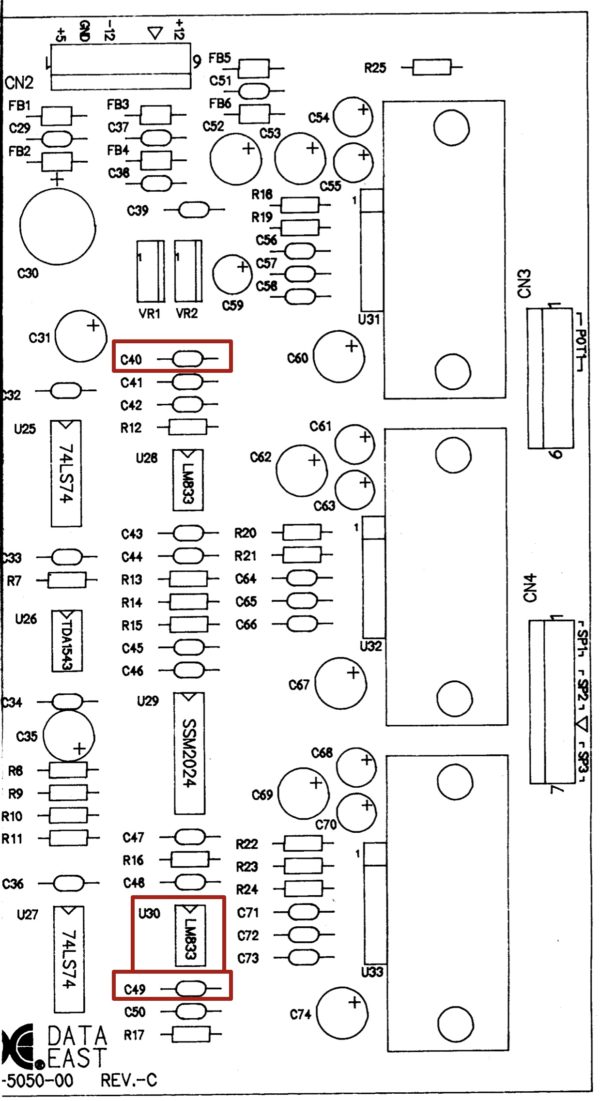DE System 3 (later) & 3B – Later Data East System 3 games, starting sometime around 1991 (Star Trek, Hook, etc.), the sound board also generated the +5V & -5V DC power for pre-amplifiers LM833N.  These boards continued to use the main power supply +5V DC for the logic and the +12V DC for the output amplifiers.  There are a number of different generations of these boards, but the power supplies seem to be the same. This picture is for the 520-5050-00 sound board. Other boards have the same power supplies with some differences.  These differences can make voltage measurements difficult.