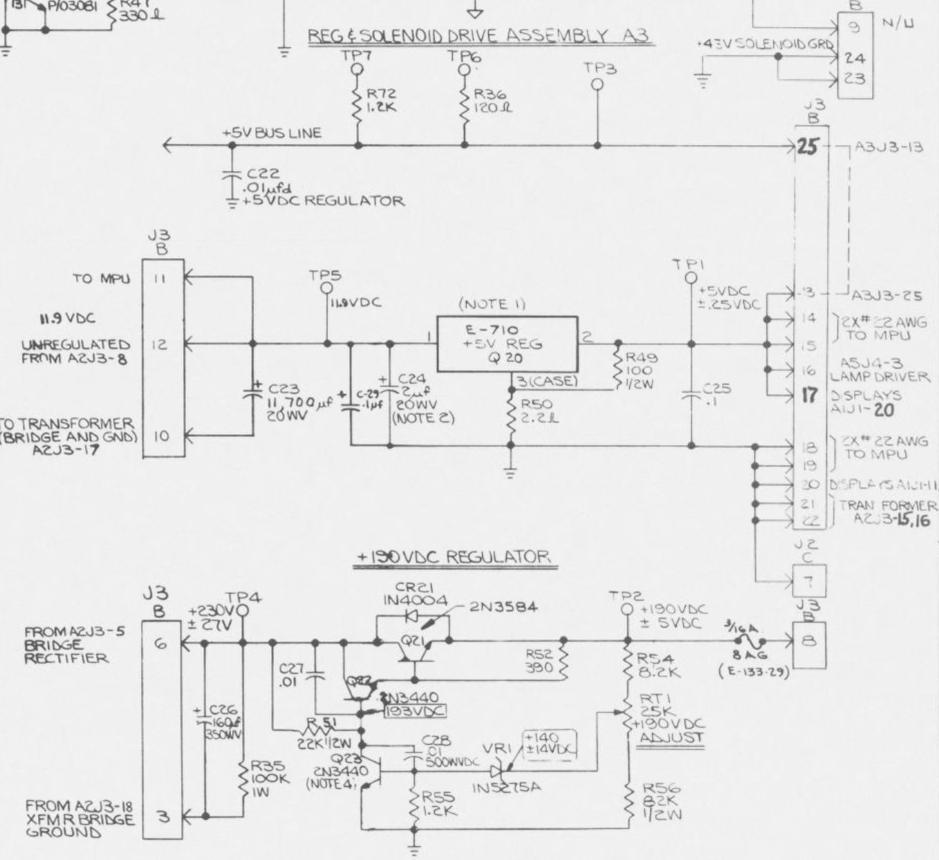 The Voltage Regulator / Solenoid Board serves two functions when it comes to power: +5 V DC power supply, and 190 V DC power supply.