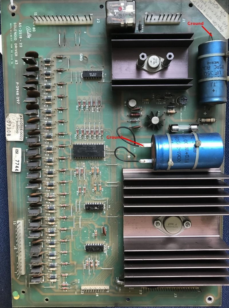 The above photo shows the Solenoid / Power Supply Board. The transistors that control the solenoids are those lined up at the bottom of this circuit board. Each one of those transistors has a metal tab. If we momentarily short that tab to ground, the solenoid should fire.
