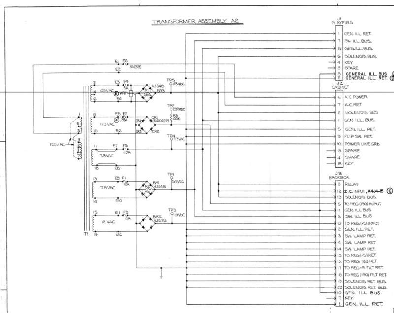 J1 goes to the playfield. When you look at the manual (we cannot post a photo here for some sad reason) you will then need to trace where each of the wires goes to the playfield. One will be to the solenoids, one to switched lamps, but four will go to the GI bulbs. That is AC so it is not terribly critical which one goes to where. But there will be two pair. One of each pair must go to ‘Gen. Ill. Ret’ and the other one from that pair must go to ‘Gen. Ill. Buss.’. Otherwise the GIs will not light.