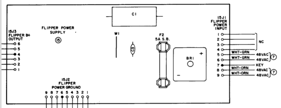 Note that these rectifiers supply the +18 V DC switched lamp power and the +28 V DC solenoid and flipper power.