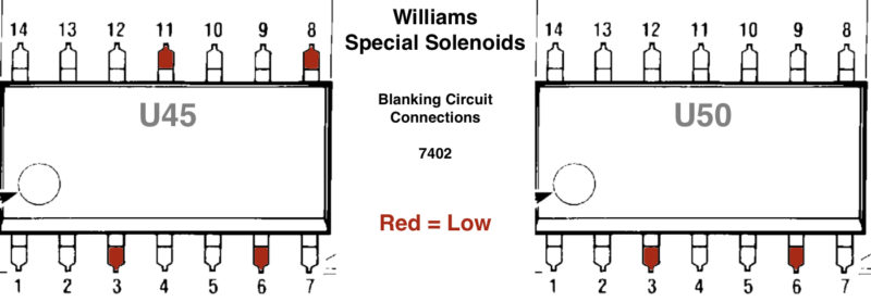 Note: Williams and Data East later models did away with Special Solenoids and converted them to computer controlled, but still used these same circuits. If there is nothing plugged into 1J18 (Williams) or CN18 (Data East), then this circuit is no longer ‘special’ but is controlled by the computer, just like the other solenoids. But the logic circuit remains the same as outlined here with IC 7402.
