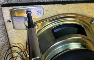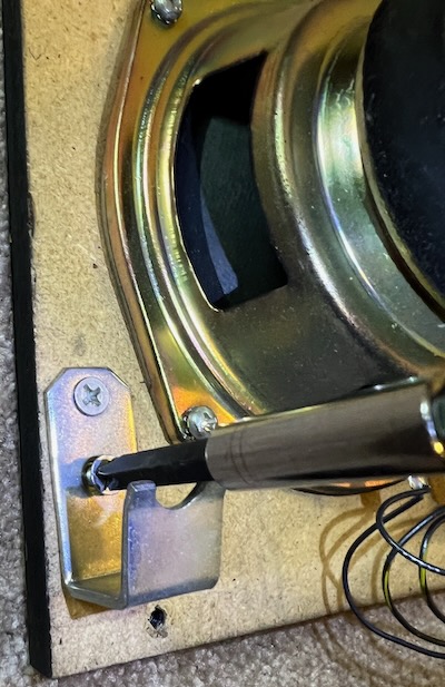 On this brand of speakers, the tabs holding the screws bend down when being tightened. That causes the screws to stick out on the other side and push on the speaker screens. So we used shorter screws. Spacers or washers could also be used to prevent those tabs from bending. We used #8-32 by 3/8″ screws. The original screw is at the top of the pair in the center of the photo.