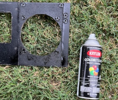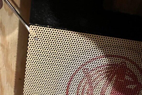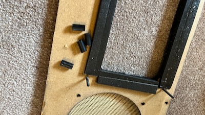 The DMD/Speaker Insert should be black on the exterior, or wood will be visible through the speaker screen. Repaint those sections with black rattle can spray paint. You can do this with the T-nuts reinstalled – lightly hammer them into position.