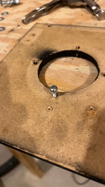 On the screen side, with the drill in reverse, carefully spin the drill bit just enough to carve a recess for the T-nut. Test the T-nut in the hole and run your finger over it to insure that it is recessed.